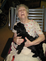 Mesa has been able to go visit my mom aka "Gramma" at the nursing home quite a few times this summer. She went again on Sunday and really enjoys going to see all the residents there. She gets a lot of attention and she in turn gets to give more than enough puppy kisses. Gramma really comes alive when she holds and pets her and Mesa gives her puppy kisses. She smiles and laughs and gets really silly. The nurses even respond on how happy she is and they do not see that very often. It's so thrilling to see Gramma so responsive. Guess this means Mesa will start going every Sunday with us! Way to go Mesa. I think you may become a "therapy dog".